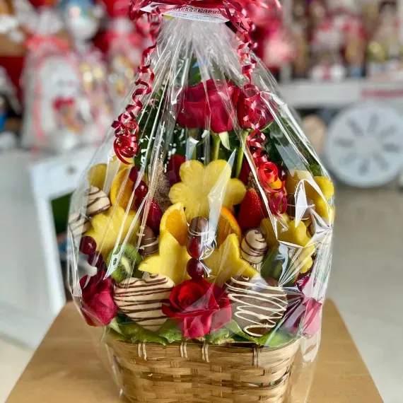 Esta presentación es realmente impresionante y definitivamente deliciosa. Este adorable ramo está inspirado en naturales fresas y fresas cubiertas de delicioso chocolate con adornos de chocolate blanco y frescos corazones de piña. Este creativo ramo es perfecto para decir te amo, me gustas, feliz aniversario o cualquier ocasión que requiera algo verdaderamente espectacular.
