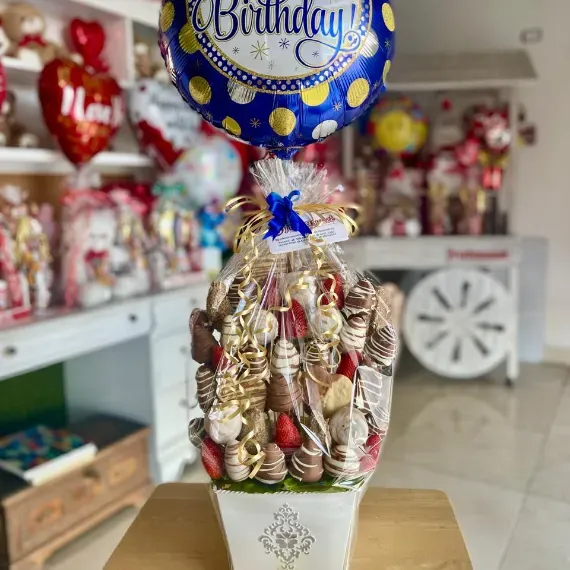 Nuestra presentación más completa. Es una hermosa pieza central de fiesta, delicioso postre, y regalo único, todo en un ramo. Super frutasweet es capaz de endulzar cualquier ocasión con lo natural de la fruta y lo sensacional del dulce. Sin más que decir… sólo falta probarlo!!!