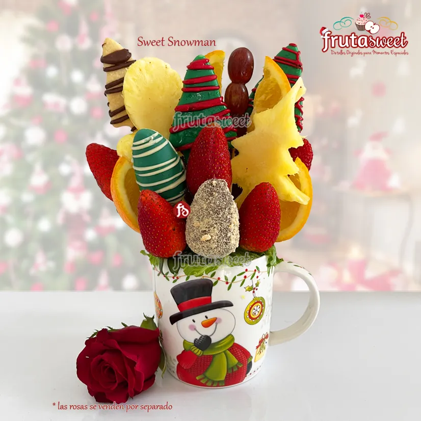 Esta presentación es ideal para los amantes de la navidad, hermosas figuras de piña, frescas frutas sumergidas en delicioso chocolate y unas deliciosas galletas artesanales. Original y hermoso para sorprender en cualquier ocasión.