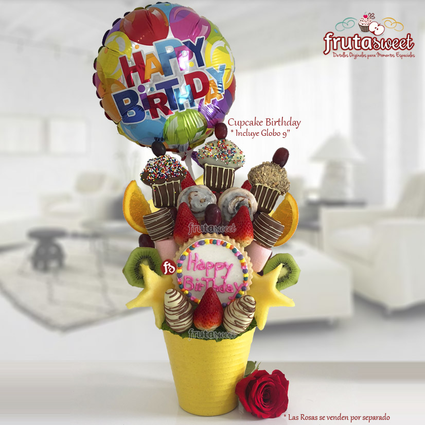 Cupcake Birthday deliciosos cupcakes de piña cubiertos con chocolate, roles de canela, frutas, malvas y galleta decorada, hacen está presentación muy divertida y sabrosa para desearle todo lo mejor a esa persona especial.