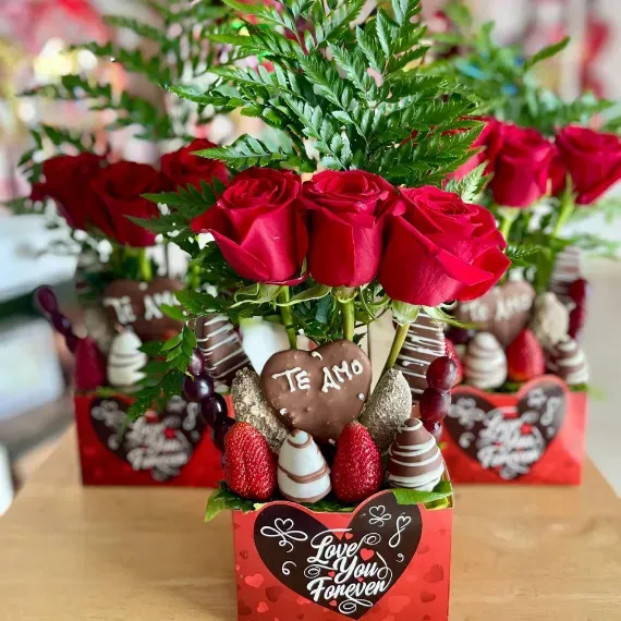 Una dulce manera de expresar lo que sientes! Love Box con deliciosa piña y fresas cubiertas con chocolate premium y rosas que le dan el toque perfecto.