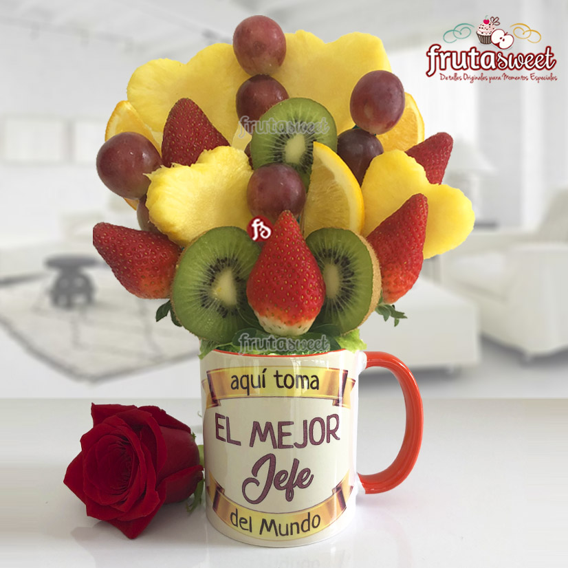 Una manera elegante, tierna y distinguida de feclicitar, agradecer o simplemente sorprender a esa persona especial. Deliciosamente preparado y delicadamente decorado con figuras de piña y variedad de frutas