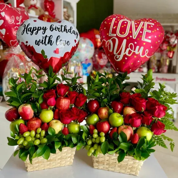 Un arreglo delicioso ideal para Sorprender, felicitar, decorar y compartir, lleno de muchos colores y frutas enteras Frescas y Deliciosas, para complacer a todos lo paladares.