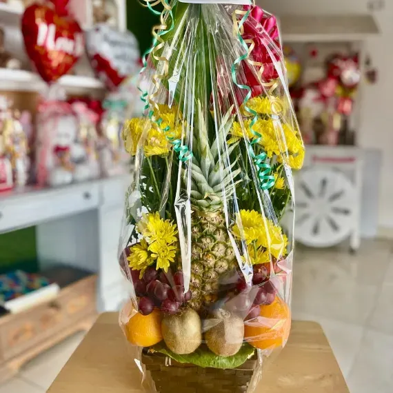 Un arreglo delicioso ideal para Decoración de Eventos y Reuniones Especiales, lleno de gran variedad de frutas enteras Frescas y Deliciosas y hermosas Flores Tropicales, para complacer a todos lo paladares.