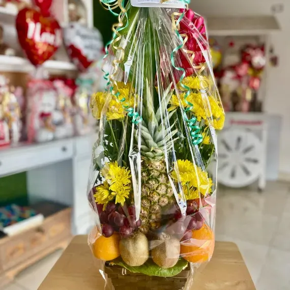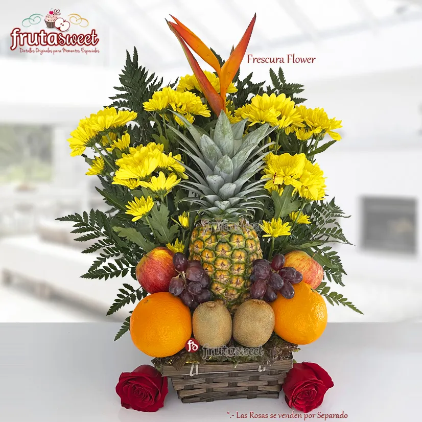 Un arreglo delicioso ideal para Decoración de Eventos y Reuniones Especiales, lleno de gran variedad de frutas enteras Frescas y Deliciosas y hermosas Flores Tropicales, para complacer a todos lo paladares.